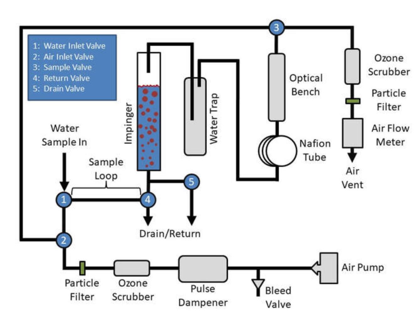 下面的示意圖顯示了儀器操作所需的附加組件。其中包括用于調(diào)節(jié)空氣流速的放氣閥、用于減少氣流波動的脈沖阻尼器、用于從環(huán)境空氣中去除臭氧的臭氧洗滌器用于噴射樣品并從排出的空氣中洗滌臭氧、空氣顆粒過濾器、用于保護(hù)空氣的集水器光學(xué)平臺暴露于液態(tài)水,Nafion 管平衡環(huán)境空氣的濕度,以及空氣流量計。
